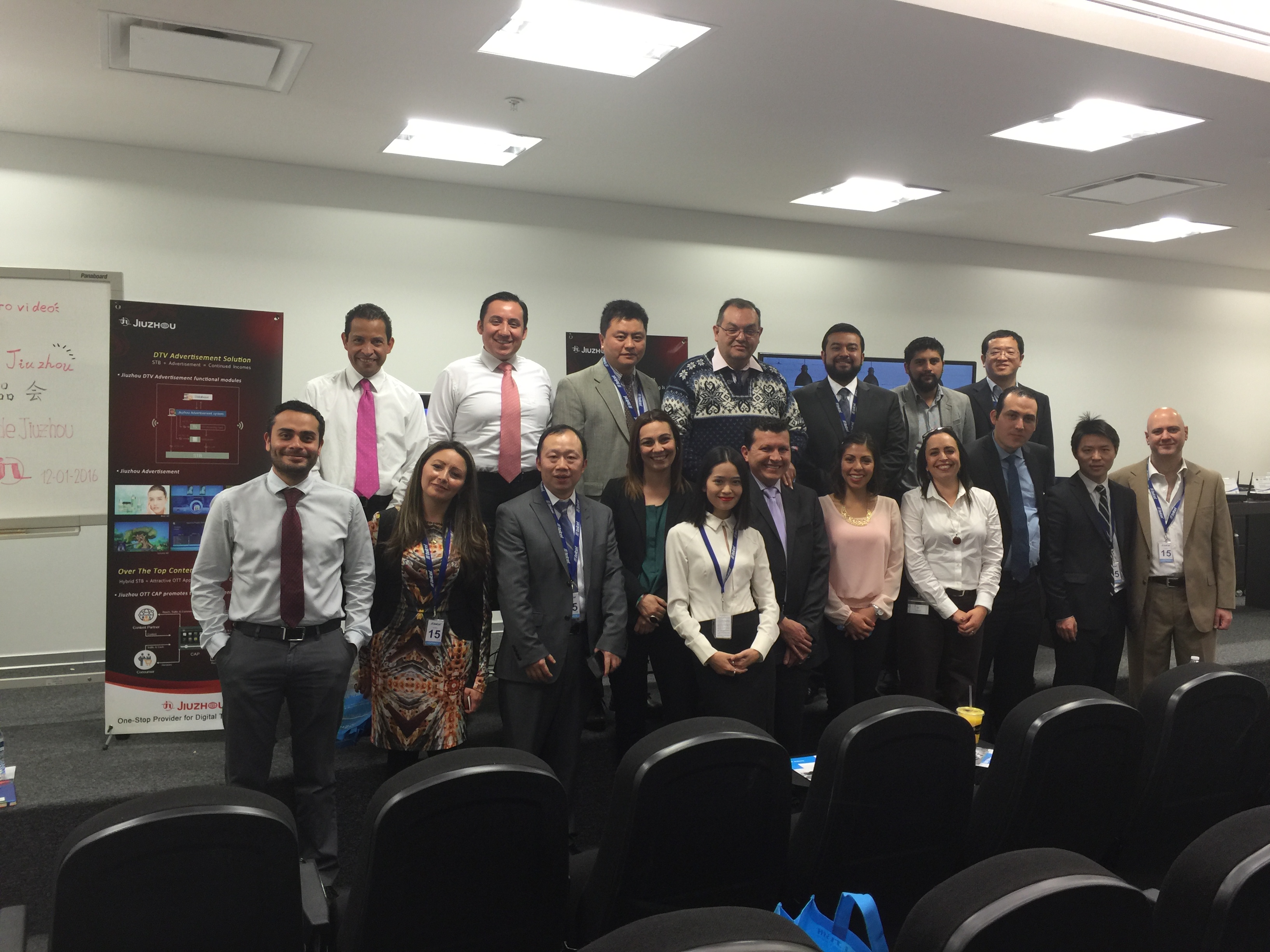 深圳九洲電器有限公司營銷團隊及聘請的哥倫比亞本地員工于2016年1月中旬在墨西哥美洲移動總部成功召開了九洲2016年度新產(chǎn)品workshop推介會。